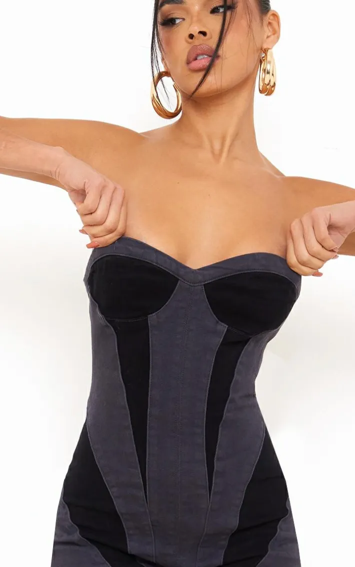 It’s time to get weekend ready with this jumpsuit. Featuring a black denim material with contrast panel detail and bardot neckline. Simple style with clear heels and hoops for a complete look.