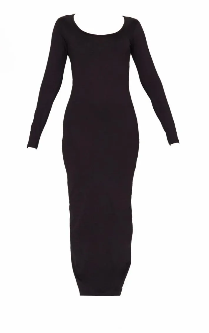Take on your weekend the right way with this statement black cotton scoop neck long sleeve midaxi dress. This dress is made from a black cotton material with a scoop neck, long sleeves and a midaxi length, this is everything we’re loving and more. With It’s figure-hugging fit this midaxi dress is sure to hug you in all the right places. To complete the look style this seamlessly with high heels and accessories for a look that will secure you all the likes.