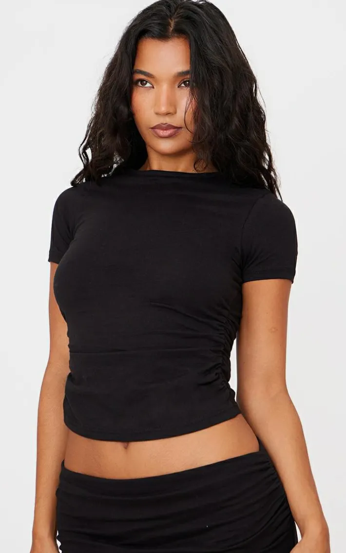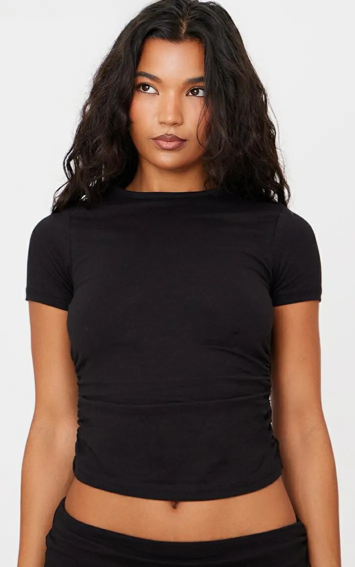 Elevate your basics collection with this black cotton side cap sleeve ruched top. Brought to you in a black cotton material with a side cap sleeve and a ruched detail, what more could you want? This top is perfect for those off-duty days. Pair with a maxi skirt and your fave boots for a finished look we are loving.