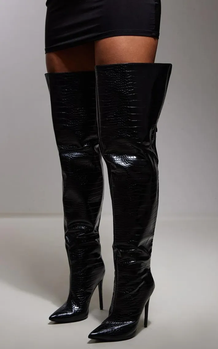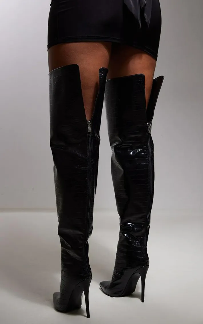 These croc PU pointed high heel over the knee boots are sure to bring all the drama to your weekend wardrobe. They’re the perfect piece to take your outfit of the day to new heights. These boots include a black croc PU material with a pointed toe design, a high heel and an over the knee style. Simply pair with your fave new season fit for the ultimate fierce finish.