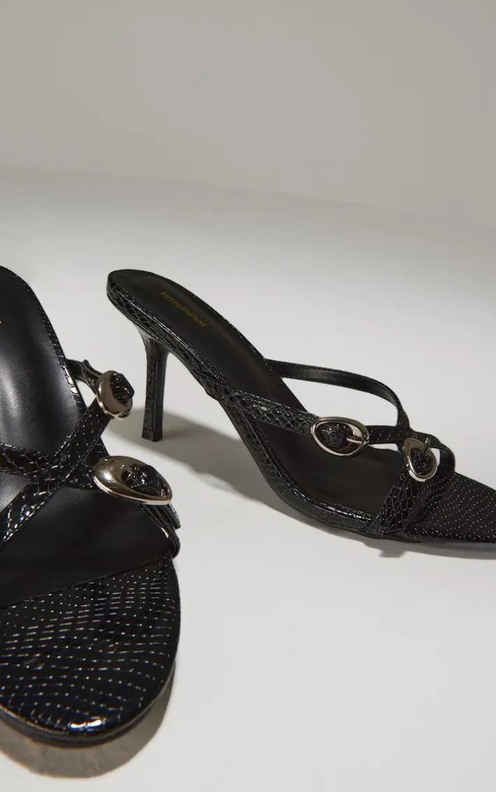 Introducing these black croc round toe silver buckle cross strap detail heeled sandals as your new season staple. Made from a black hue material with a croc pattern, round toe design, silver buckle and cross strap detail, these heeled sandals are a must have. Style with an all black fit to elevate the look. How can you resist?