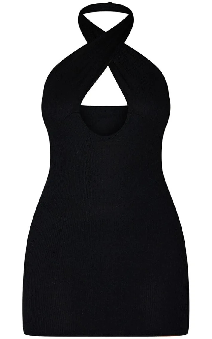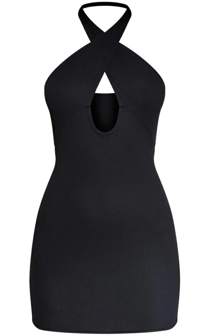 Your weekend look is finally sorted with this figure-flattering dress. Featuring a black rib material with a cross neck design and cut out detailing. Just add statement accessories and heeled boots for a look that will get you noticed.