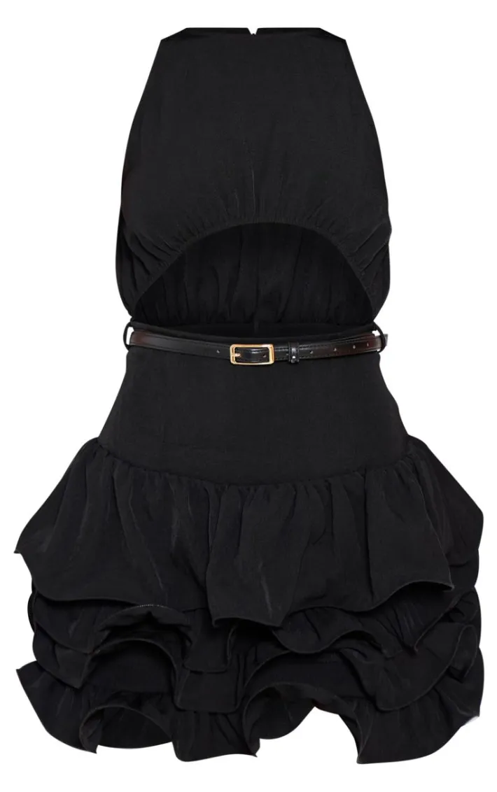 , this black cut out belted frill hem mini dress is everything you need and more. Brought to you in a black hue material with a cut out detail, belted design, and frill hem, this mini dress is a must have. Style with chunky loafers and simple accessories for a chic finish we can’t take our eyes off.