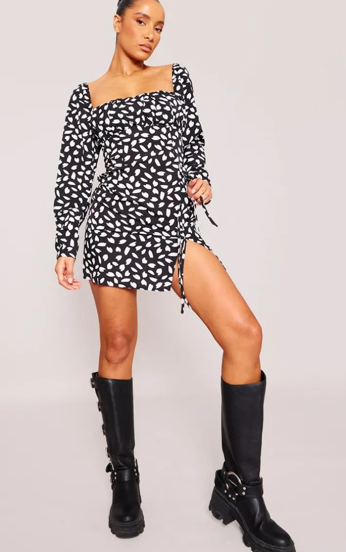Give your off-duty look a bold update with this printed dress. Featuring a black dalmatian print material with long sleeves and bow detailing, dress it down with some chunky boots for a look we’re loving.