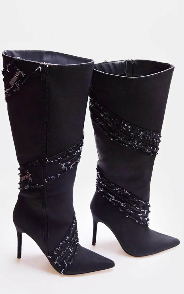 Be the topic of everyone’s conversation in these black denim diamante detail point toe high heeled knee boots. When the weekend calls these statement boots have you covered. Brought to you in a black denim material with diamante detailing, a pointed toe and a high heel, how could you resist? Wear with your weekend look for a show-stopping finish.