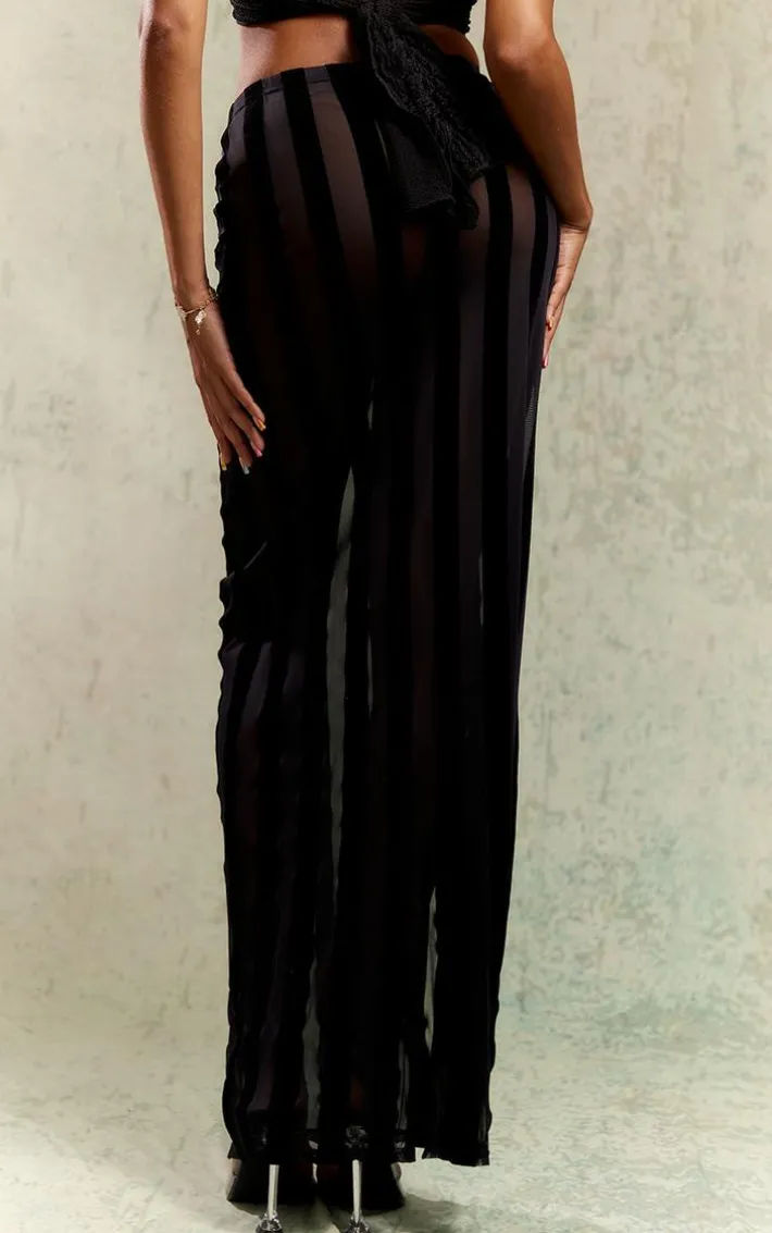 Got a special occasion penciled into your diary? Well we’ve got you covered with this black devore mesh striped maxi skirt. This maxi skirt is brought to you in a black devore mesh material with striped detailing and a maxi length, what’s not to love? This maxi skirt will have you earning all the likes. Complete the look by teaming this with a black crop top, high heels and accessories for a look like no other.
