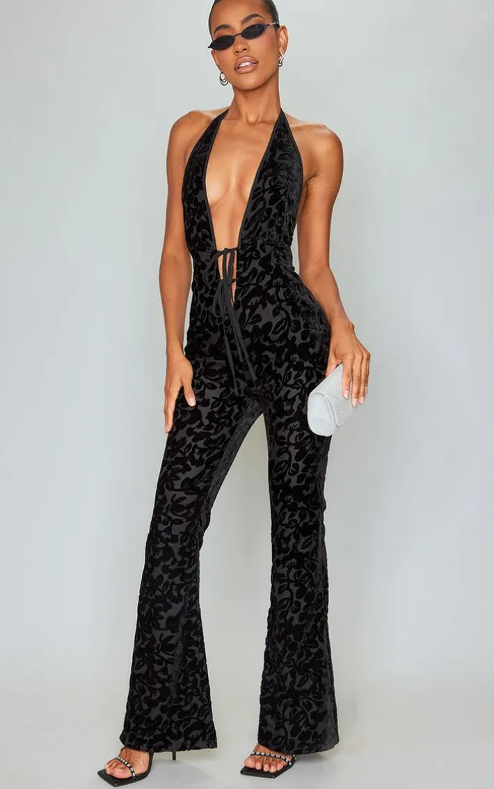 When the weekend calls, so does this black devore plunge tie detail flared jumpsuit. This unreal jumpsuit is made from a black devore material with a plunge tie detail, what’s not to love? Its flared design is all you need to stand out from the rest. Team with some clear heels, your fave shades and a clutch bag to complete the look we are loving.
