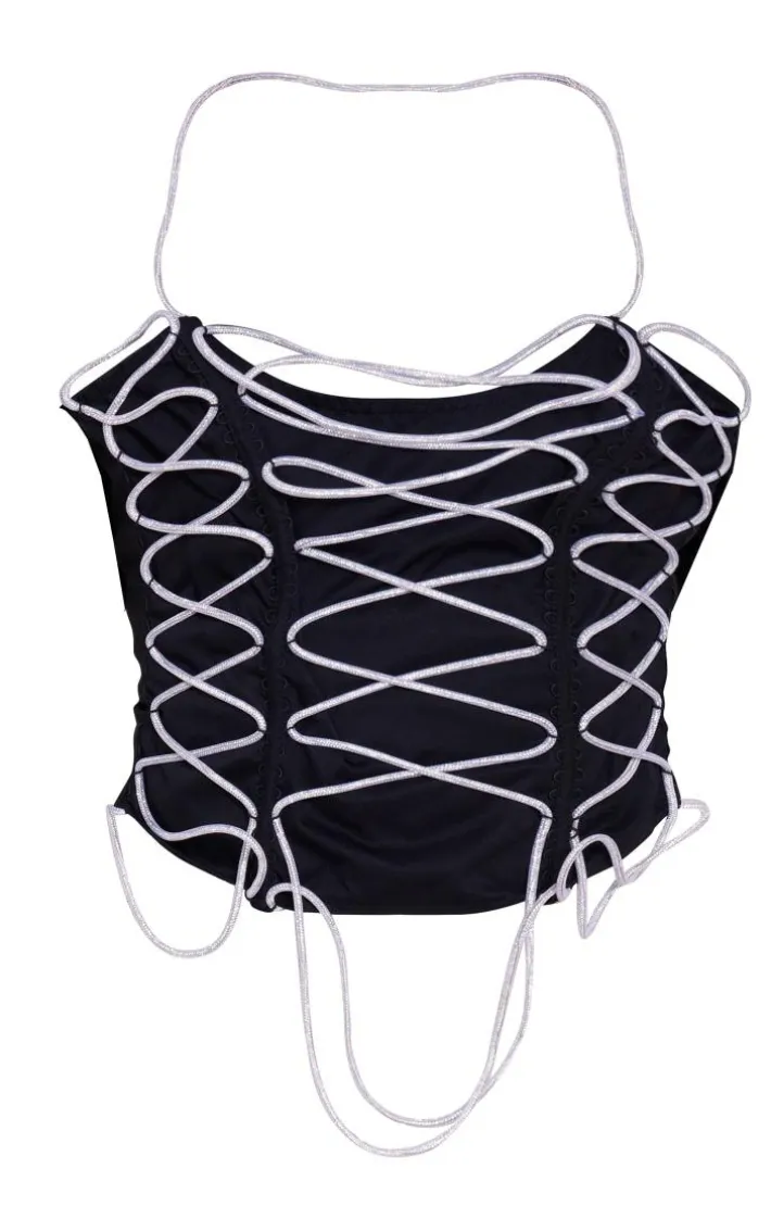 Take the stress out of weekend styling with this unreal black diamante elastic lace up corset. This corset is brought to you in a black diamante material with a lace up design completed with an elastic waist, you really can’t go wrong with this corset. Style with clear strap heels and gold accessories for a look that will have eyes on you for all the right reasons.