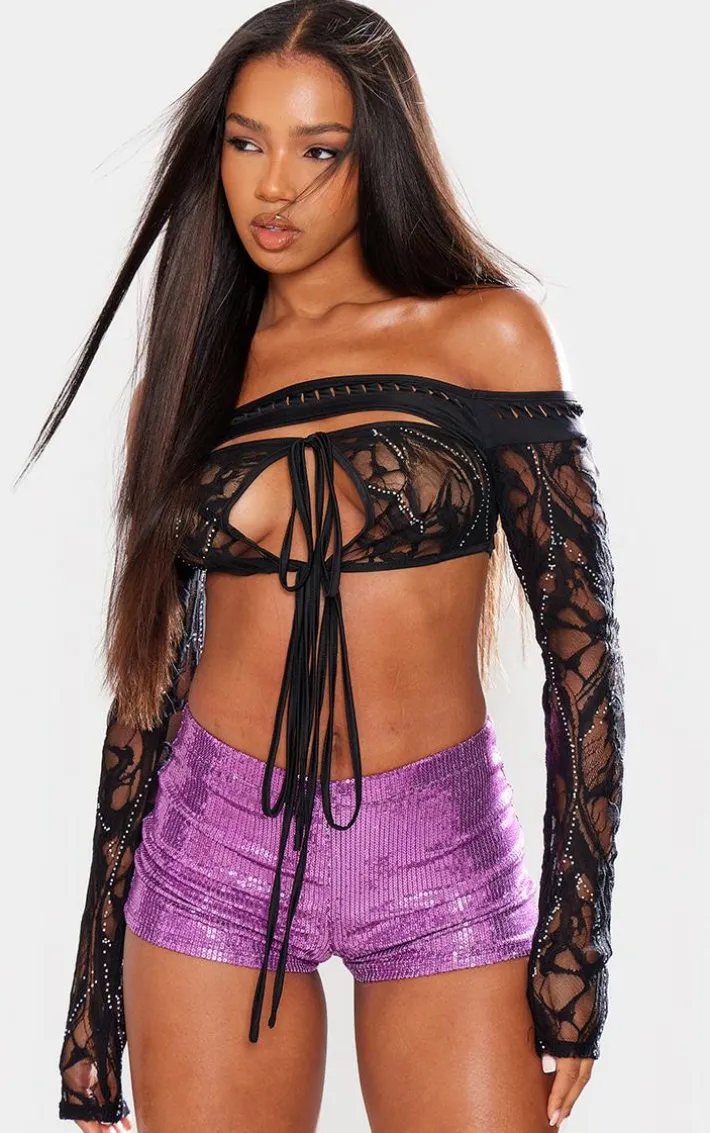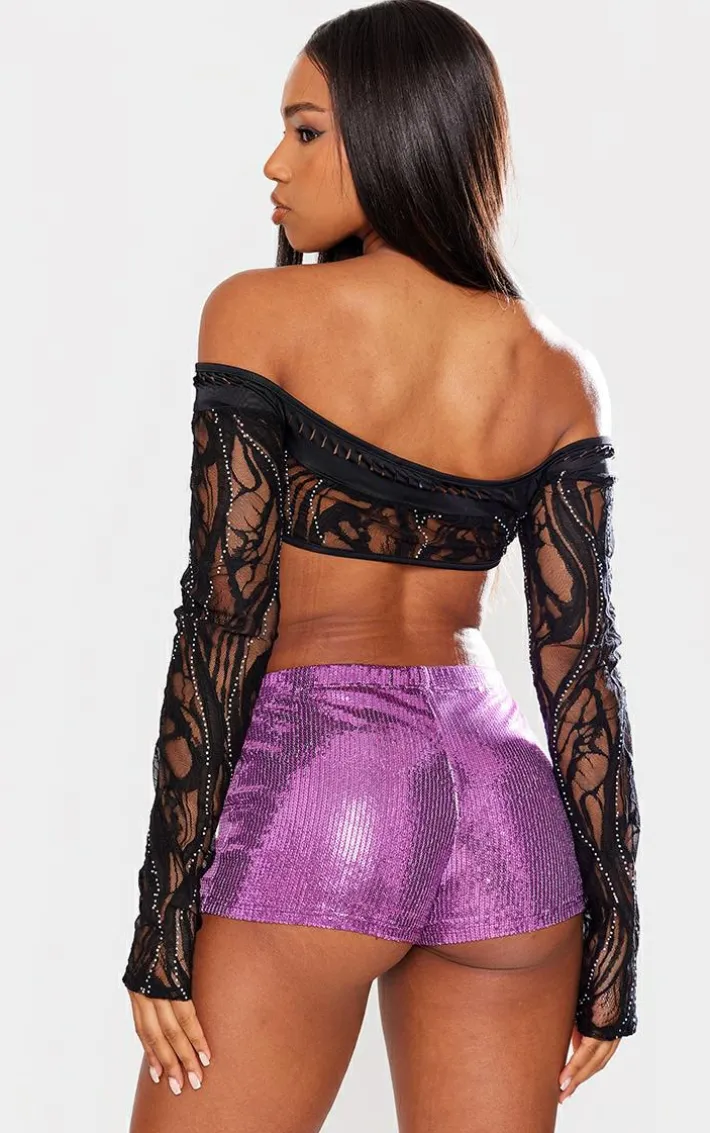 When the weekend calls for a little drama this black diamante lace cut out long sleeve crop top will have you at the center of attention. It is made using ablack material with lace diamante detailing, long sleeves and a cropped length, what more could you want ? Style this with purple hot Pants, clear slip-on heels and statement accessories to elevate the look further.