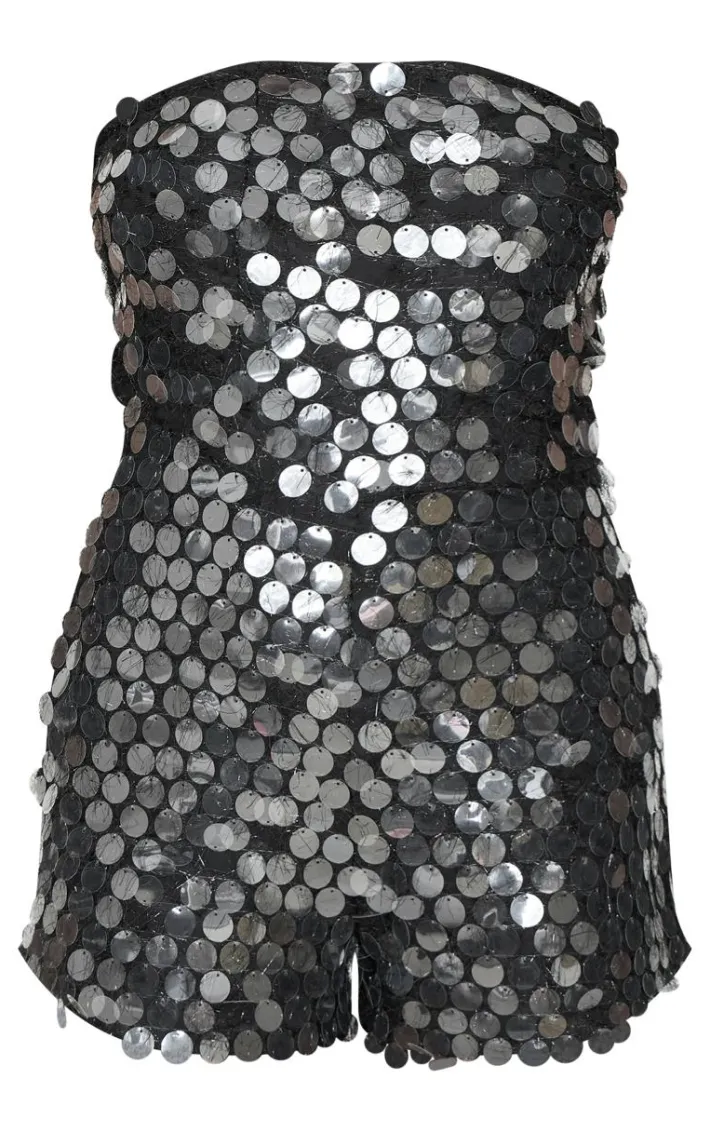We’re in love with this black disc sequin bandeau romper. Brought to you in a black hue material with a disc sequin design and bandeau neckline, this romper is a must have. How can you resist? Team with slip on heels and simple accessories for a look like no other.