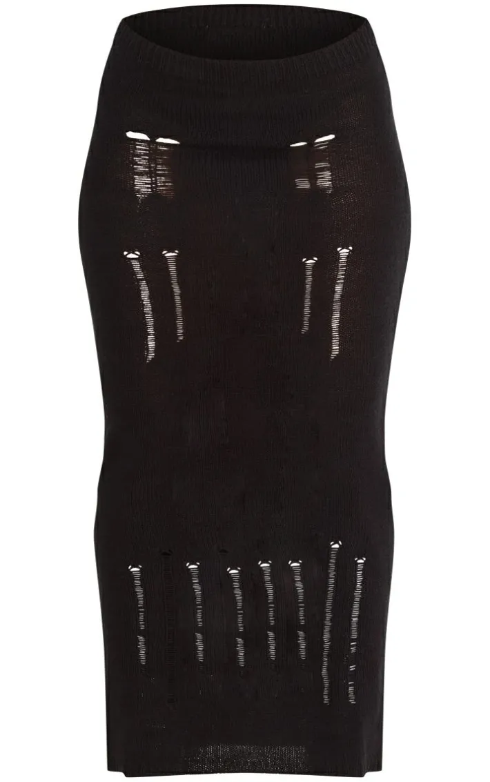 Add a little attitude to your outfit of the day with this black distressed ladder knit maxi skirt, you won’t be able to resist this statement piece. It is made using a black ladder knit material with a distressed design and a maxi length, we’re in love. Team this maxi skirt with the matching top, heeled boots and a shoulder bag for a fool proof finish.