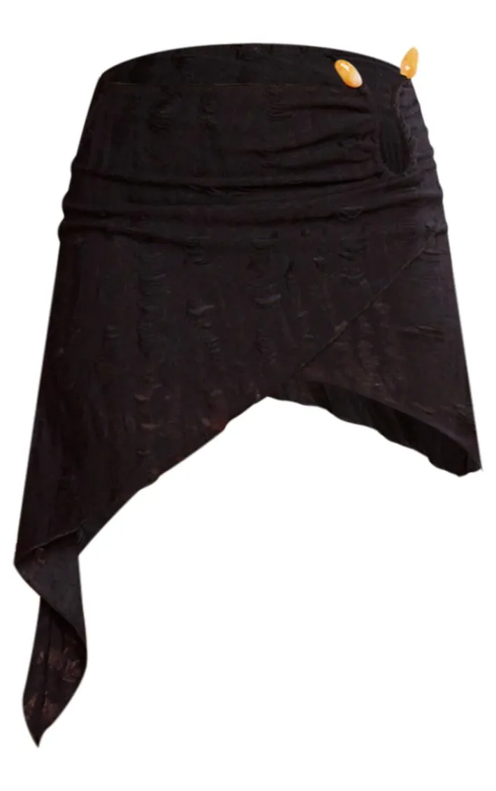 Elevate your new season wardrobe with ease with this blakc distressed textured handkerchief hem bead trim mini skirt, we’re in love. This skirt is brought to you in a black distressed textured material with a handkerchief hem and bead detailing. Pair with a matching hue top, strappy heels and a shoulder bag for a look worthy of your weekend plans.