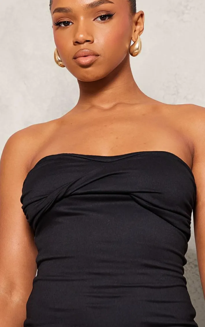 Your new season collection is calling out for this black double contour twist bandeau ruched bodycon dress. Brought to you in a black material with a double contour design and a twist bandeau fit, what more could you want? Its ruched detailing makes this bodycon dress the ultimate must have in your wardrobe. Team with your fave heels and accessories to complete the look we are loving.