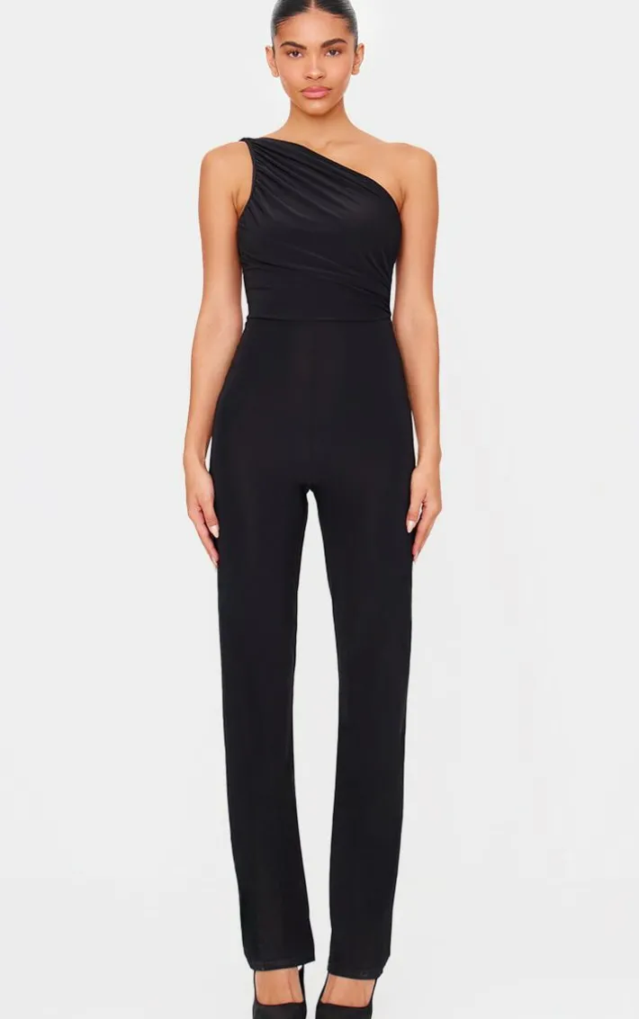 Switch out your little black dress for this black double layer slinky asymmetric ruched detail jumpsuit. Brought to you in a black double layer slinky material with an asymmetric neckline and ruched detailing, we are obsessed. Seriously chic and in a figure-flattering fit, this black jumpsuit is here to solve all of your wardrobe dilemmas. Just add heels to complete the look.