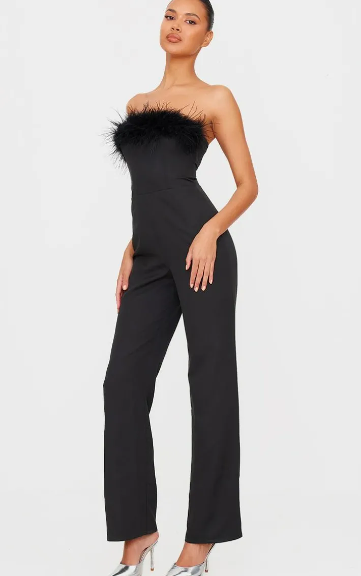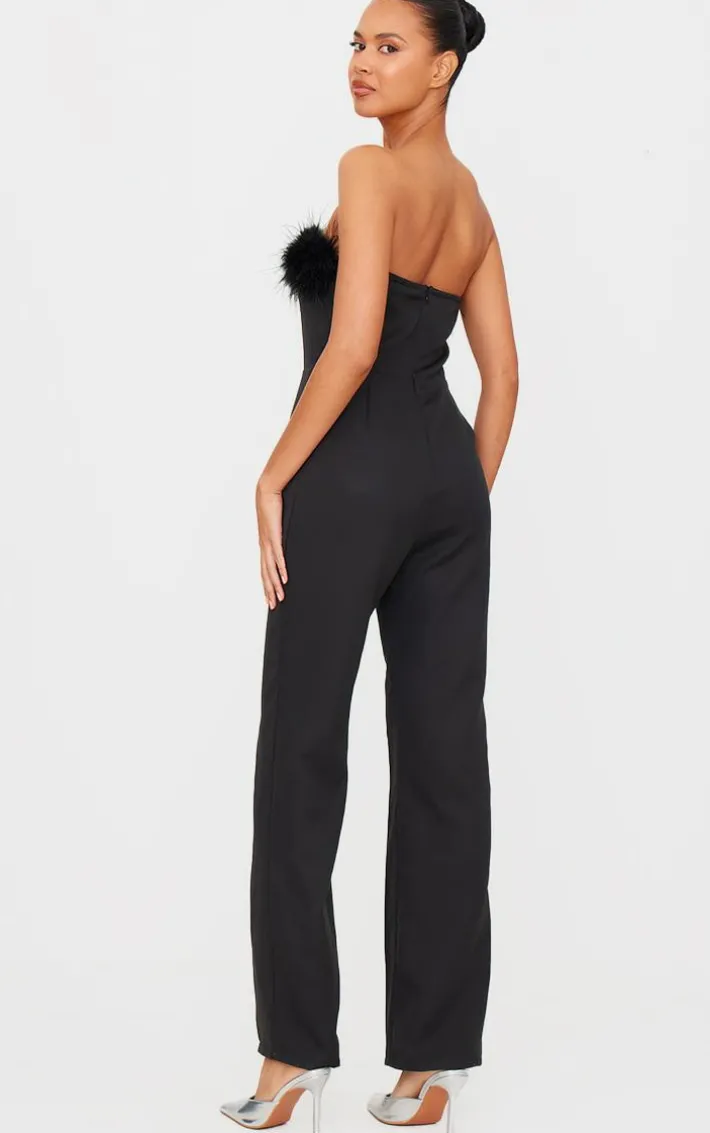 Switch out your staple little black dress for this chic black faux fur bandeau straight leg jumpsuit. Made from a black material with a bandeau neckline, faux fur detailing and a figure flattering straight leg fit, how can you not be obsessed? Elevate the look with court heels and simple gold accessories.