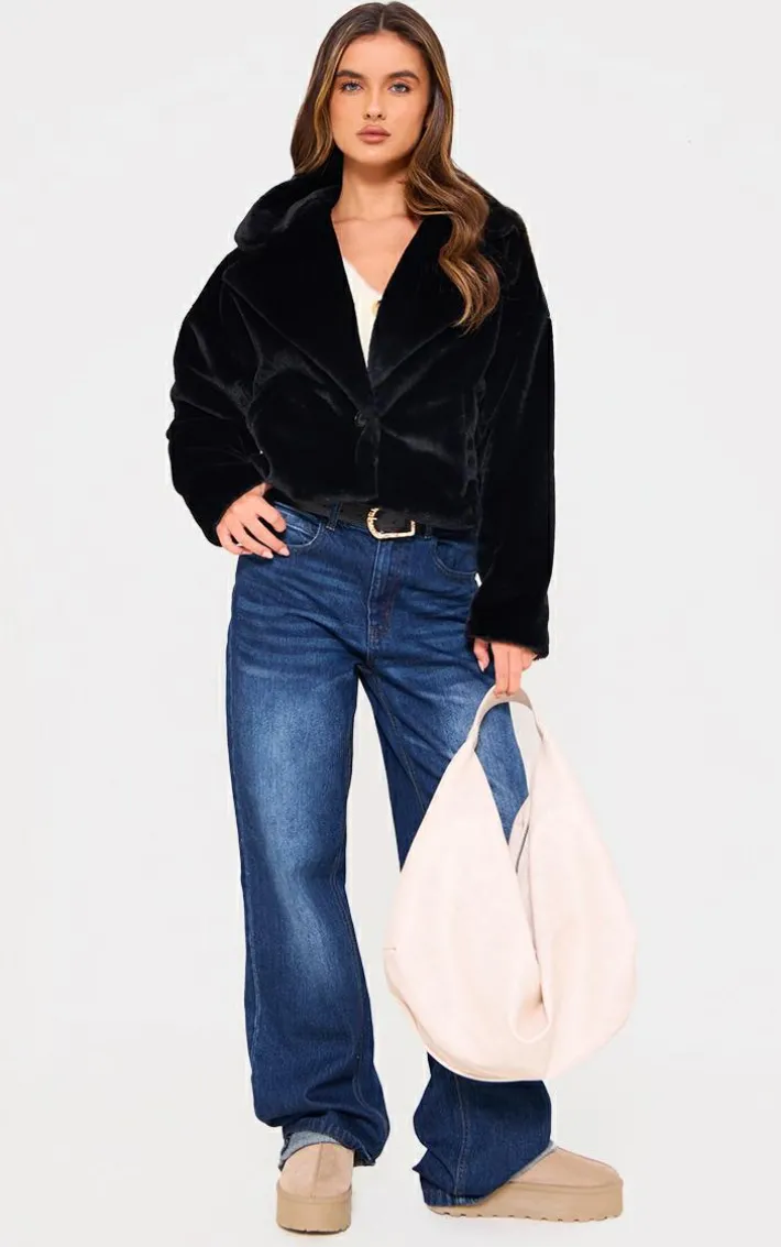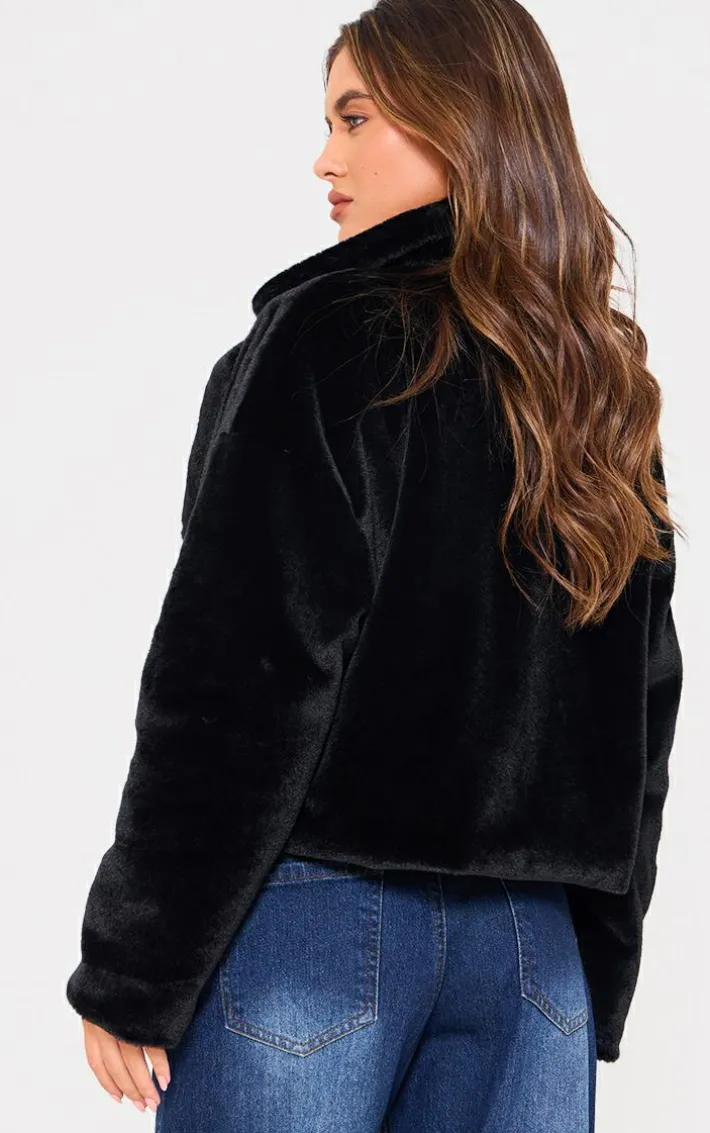 Introducing this black faux fur cropped blazer. Made from a black hue faux fur material with a cropped length, this blazer is a must have. How can you resist? Style with blue jeans, cosy slipper boots and gold accessories for a chic finish that will keep you warm and stylish all season long.