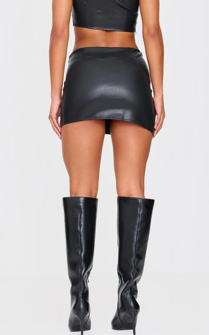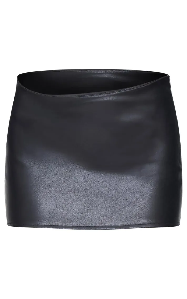 Add an edge to your weekend look with this black faux leather asymmetric hem mini skirt. Brought to you in a black faux leather material with an asymmetric hemline and a mini length, how can you resist? Pair this mini skirt with the matching top and knee high boots for a look that will really make a statement.