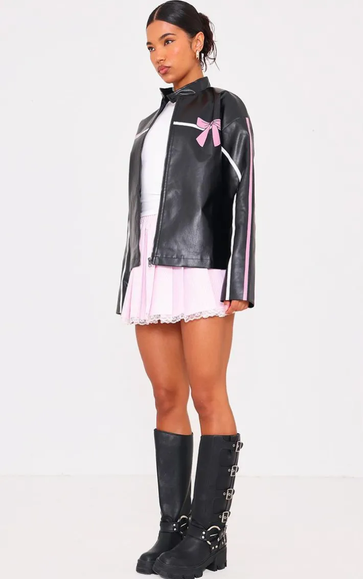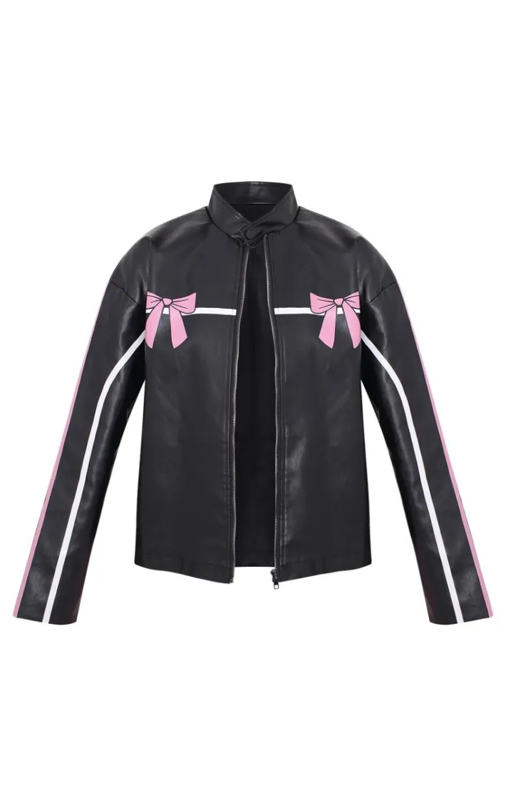 Earn all the styling points with this black faux leather bow print detail jacket. Brought to you in a black faux leather material with a bow print design that will have you setting major trends wherever you step foot. Team this unreal jacket with a white tee, a mini skirt and some knee high chunky boots for a fool proof finish like no other.
