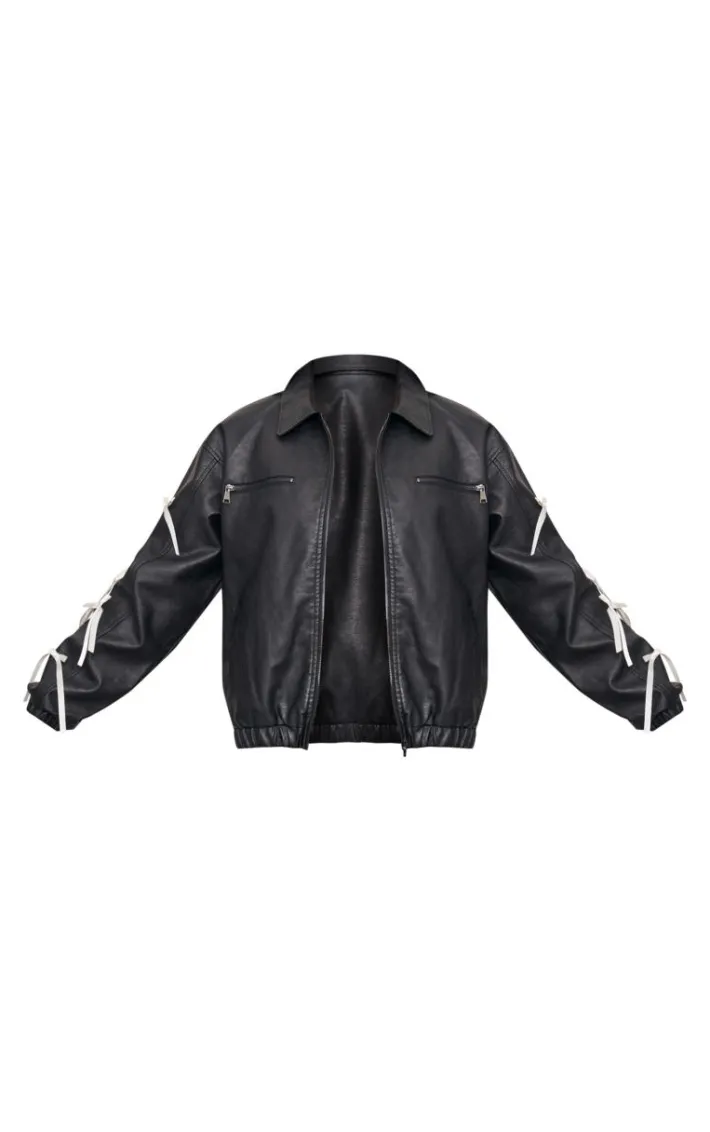 Bring all the edge to your outfit of the day with this black faux leather bow sleeve detail oversized jacket. Brought to you in a black faux leather material with a bow sleeve detail and an oversized fit, what’s not to love? Team with a mini skirt and a crop top for a fool proof finish.