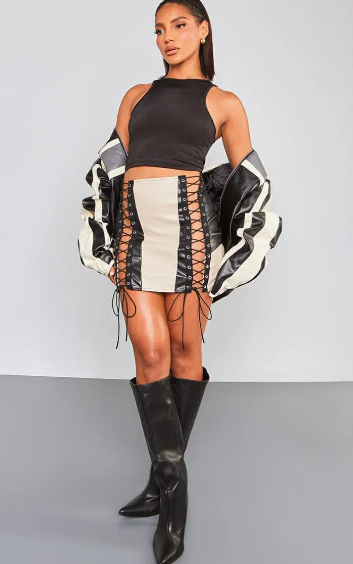 Bring all the drama to your weekend plans with this black faux leather contrast panel lace up mini skirt. Made from a black faux leather material with a contrasting panel design and lace up detailing, what more could you ask for? Style this mini skirt with a racer neck top, knee length heeled boots and a faux leather jacket for a look that is sure to make a serious style statement.