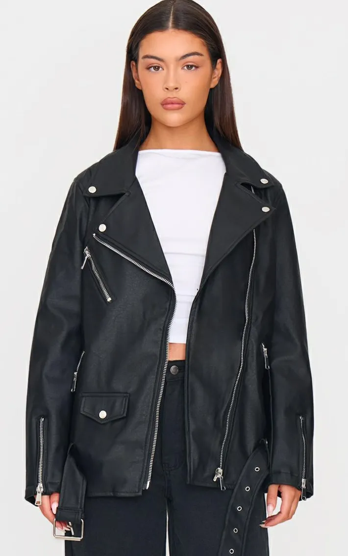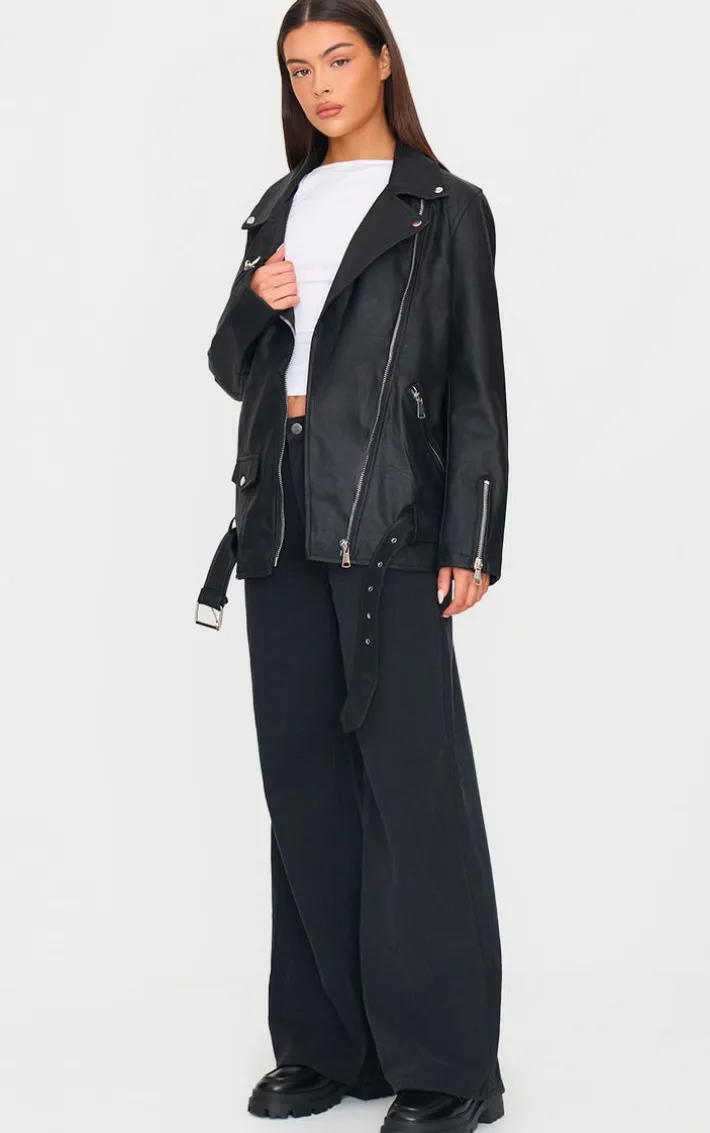 Give your look a fierce edge with this must-have black faux leather longline belted Biker jacket. Brought to you in a black faux leather material with zip detail and an oversized fit, what’s not to love? Style with a white tee, pants and loafers for an instant chic look everyone will want.