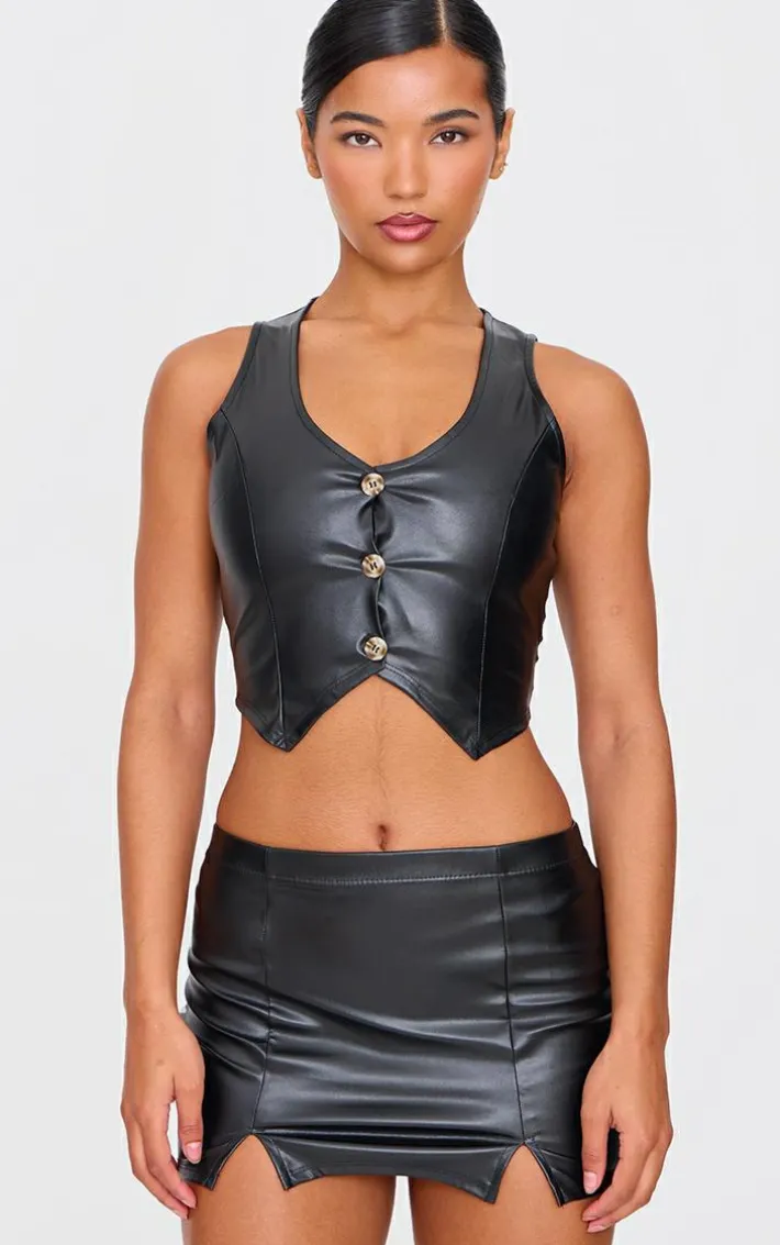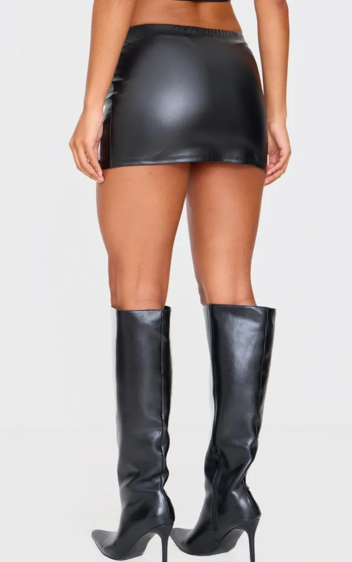 Elevate your evening look with this black faux leather micro mini skirt. Made from a black hue faux leather material with a micro length, this mini skirt is a must have. Team with the matching vest, knee high heeled boots and gold accessories for a chic combo everyone will be asking you about.