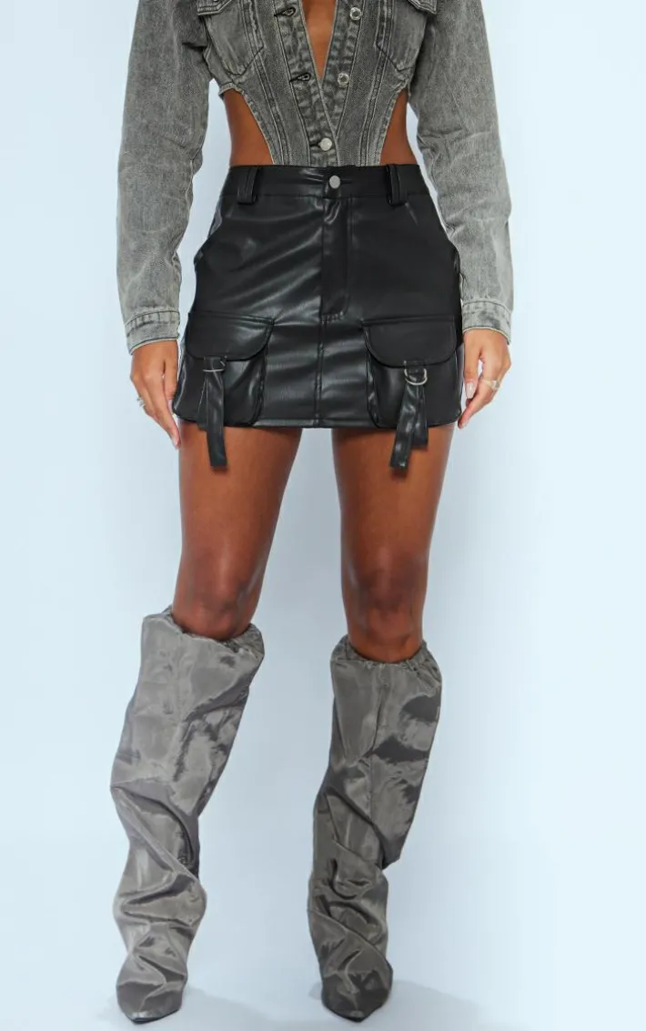 This black faux leather pocket detail cargo mini skirt is at the top of our new season hit list. Brought to you in a black hue faux leather material with an on-trend cargo design, pocket detailing and a mini fit, how can you not be obsessed. Perfect for dressing up or down, you will be reaching for this faux leather skirt again and again. Style with a denim bodysuit and knee high heeled boots for a weekend-worthy look that will really make a statement.