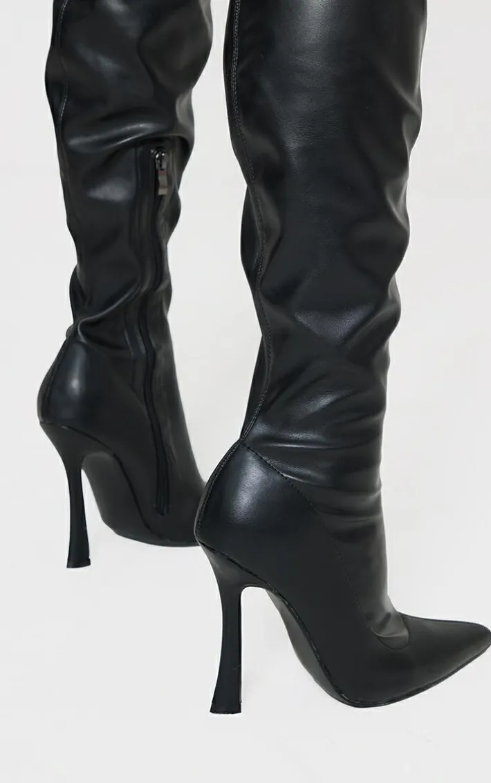 Give your weekend look an edgy vibe with these black faux leather point toe sock heeled over the knee boots. Brought to you in a black faux leather material with a point toe design and over the knee fit, what’s not to love? These over the knee boots are all you need to make a statement. Team with your outfit of the night for a flawless finish.