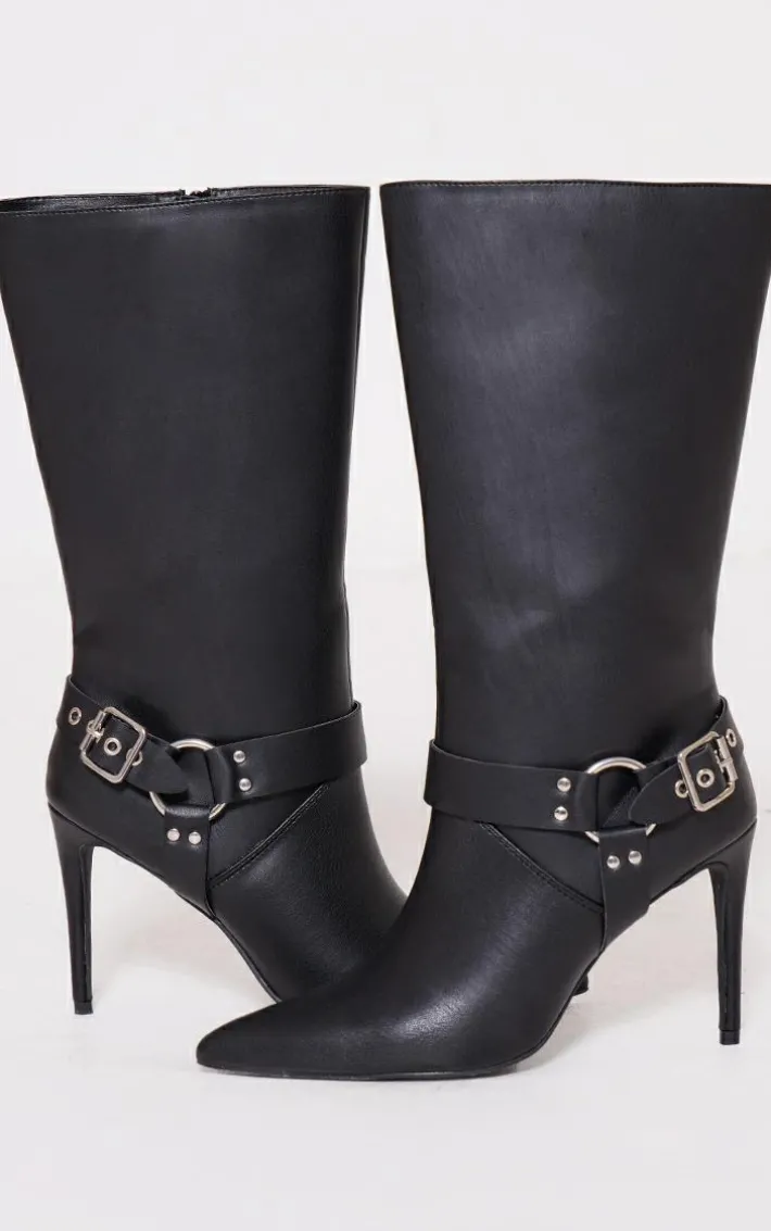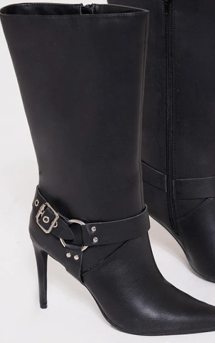 Got plans for the weekend? Then these black faux leather ring buckle detail tall knee high heeled boots will help show off your confident side. With a black faux leather material, buckle detailing and a high heel, these boots just went straight to the top of your hit list. Pair with your fave outfit of the day for a fierce finish.