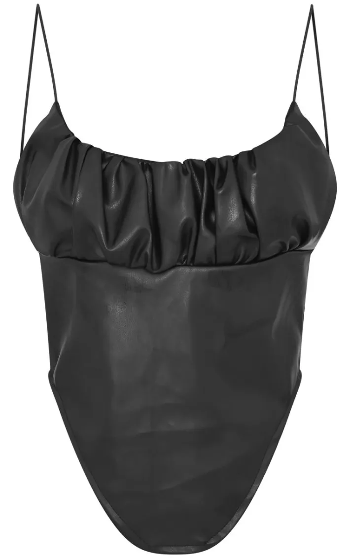 Amp up your weekend wardrobe with this next-level top. Featuring a black faux leather material with a curved hem and ruched bust detailing, we’re obsessed. Wear with matching bottoms and heels for a night.
