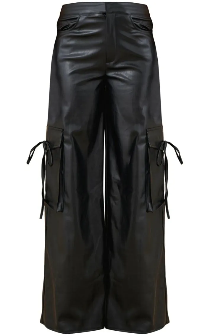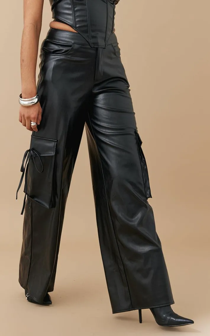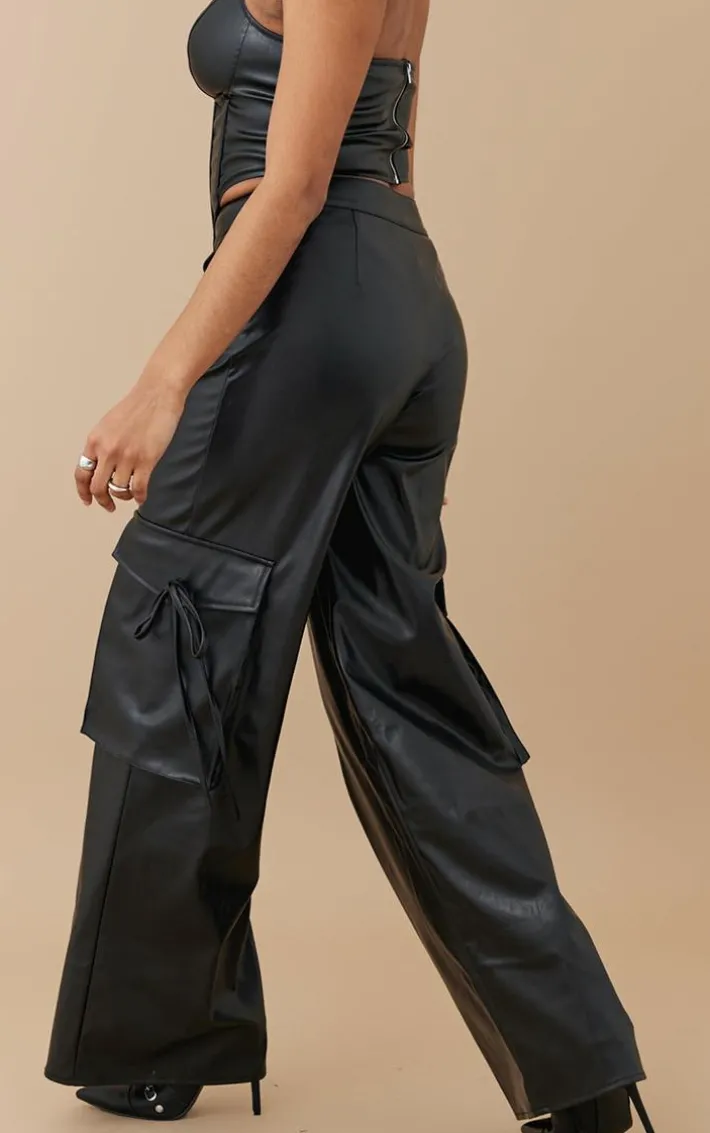 Bring all the drama to your weekend wardrobe with these bottoms. Featuring a black faux leather material with a straight leg fit and a cargo style. Pair with the matching top and your highest heels to have all eyes on you.