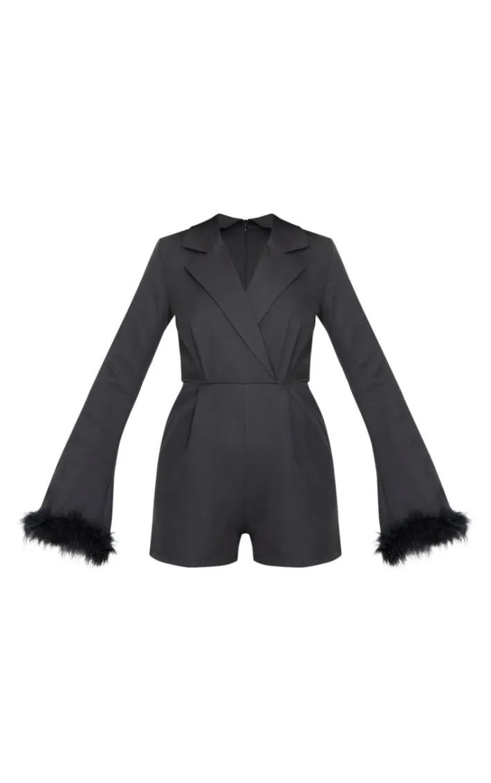 Give your wardrobe a seriously chic update with this romper. Featuring a black hue material with a feather cuff detail and a flattering fit. Style with some silver hoops and a silver bag with matching heels to complete this effortlessly chic look.