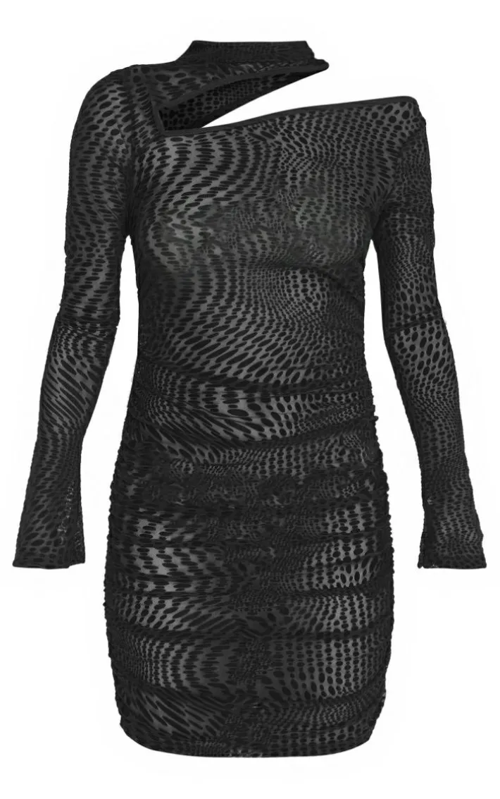 This black flocked mesh high neck cut out ruched bodycon dress is here to banish any of your what to wear dilemmas. Brought to you in a black flocked mesh material with a high neck, a cut-out design and a figure-hugging fit, we can’tget enough. From start to finish this bodycon dress will have you looking totally on-trend. For a next-level look simply style with high heels and accessories for a look that will have you setting trends wherever you step foot.