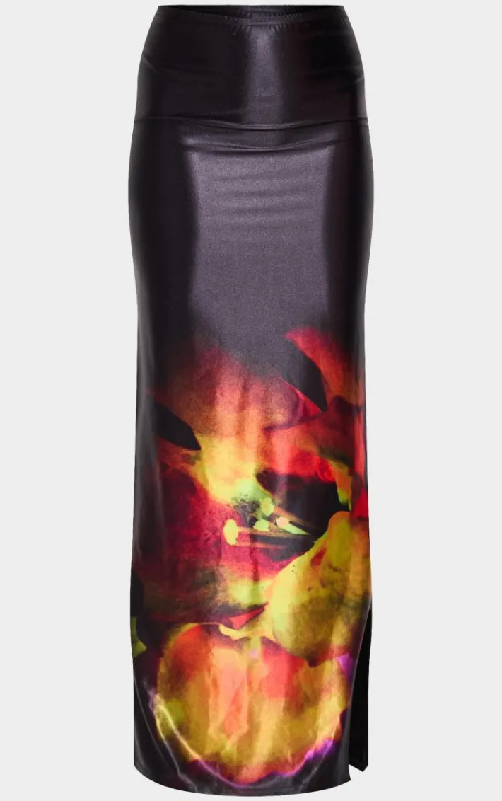 Your wardrobe is calling out for this black floral blur print stretch satin maxi skirt for your new season look. Brought to you in a black stretch satin material with a floral blur print and a maxi length, how could you resist? Team with a flattering tee and a pair of heels for a look that will have you standing out from the rest.