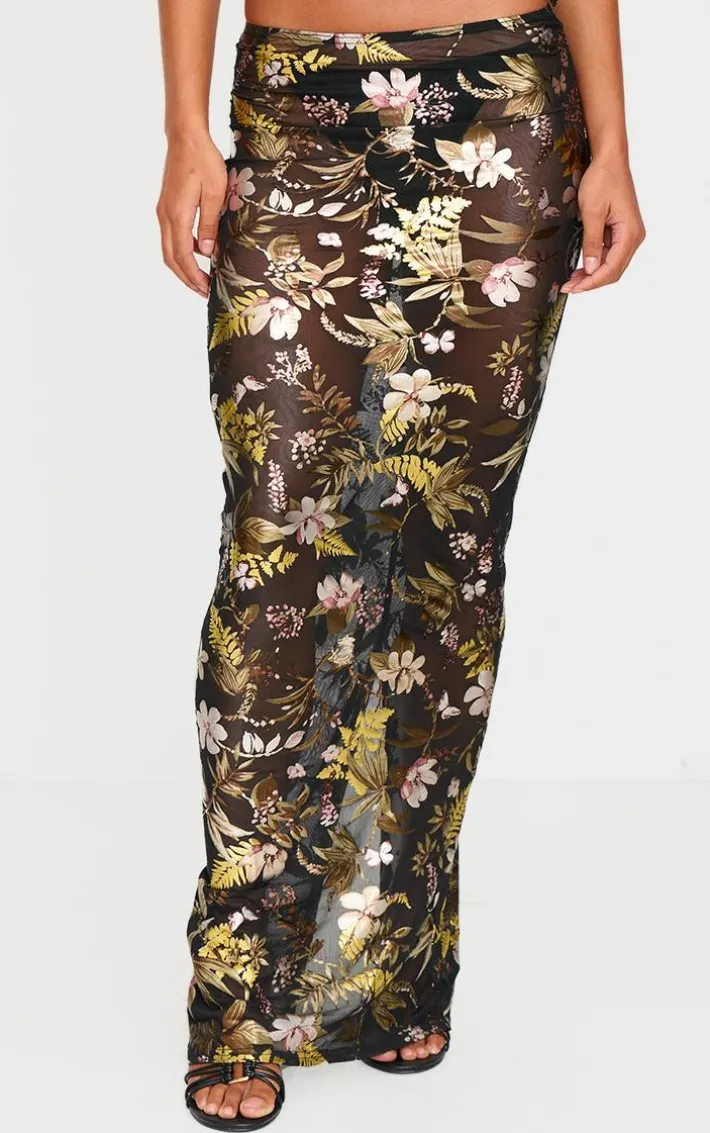 Introducing this black floral foil printed mesh maxi skirt as your new season go to. Made from a black hue mesh material with a floral foil printed detail, this maxi skirt is a must have. Style with the matching crop top, high heels and simple accessories for a look like no other. It’s a yes from us.
