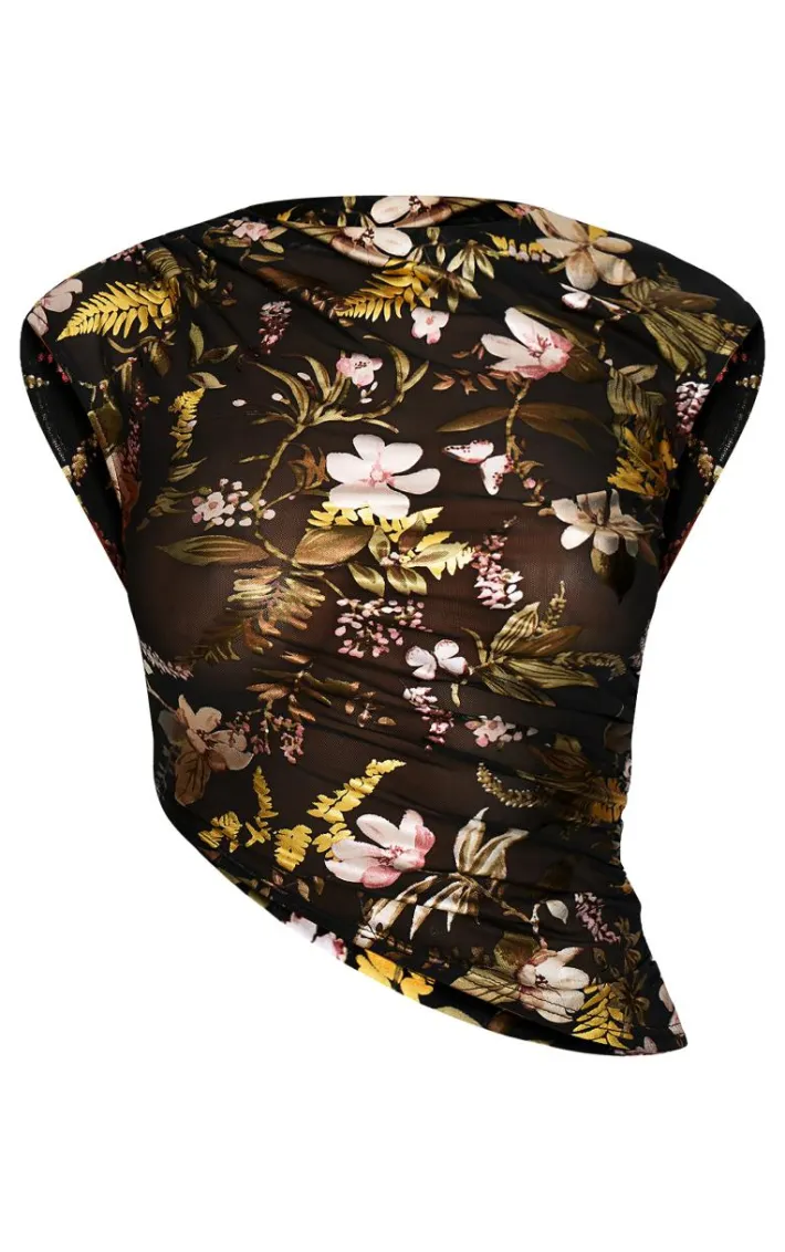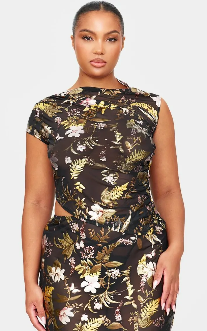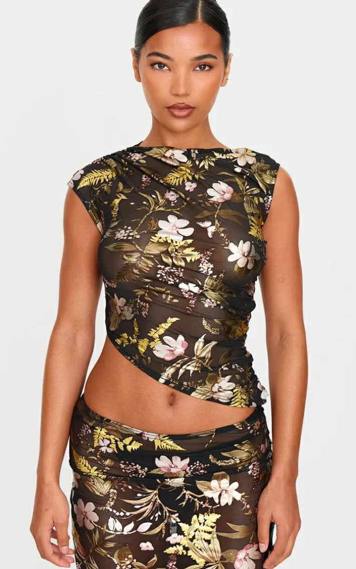This black floral foil printed mesh ruched crop top is a must have this season. Brought to you in a black hue mesh material with a floral foil printed design and ruched detailing, this crop top is all the new you need. Team with the matching maxi skirt, high heels and gold accessories for an elevated finish.