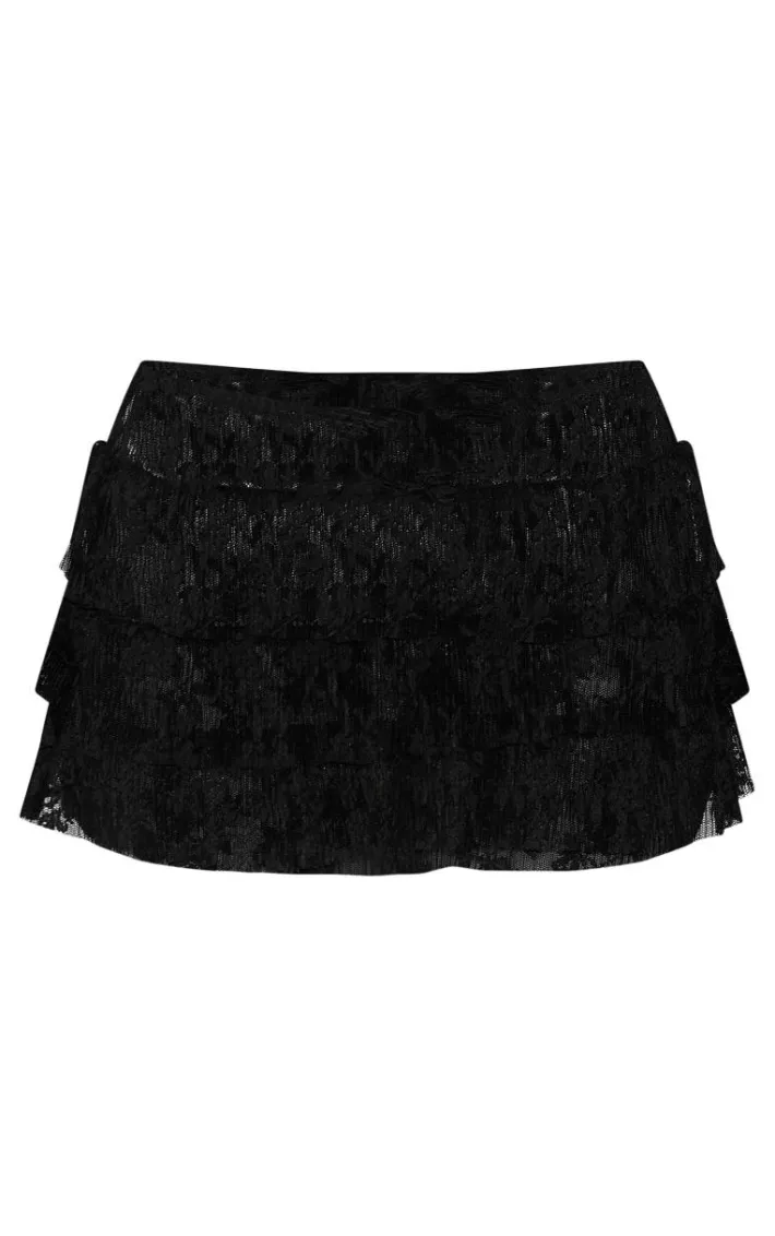 Add a touch of elegance to your going out wardrobe with this black floral lace ruffle micro mini skirt. With its delicate black floral lace fabric, with ruffle detailing and a micro mini skirt skirt length, you’ll walk into any room with confidence. Shop the look and style with the matching top, gold jewelry and slip on heels.