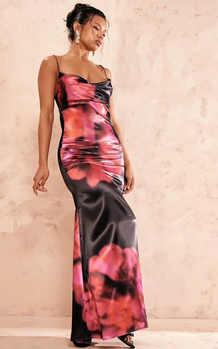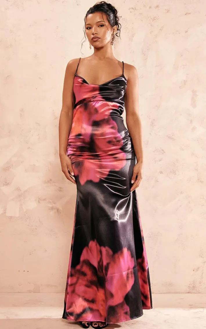 Make a statement this season with this black floral satin cowl neck maxi dress, you’re sure to be at the center of attention. This dress features a black satin material with a floral print and a cowl neck design, how could you say no? Style this satin dress with strappy heels and hoop earrings for a flawless finish.