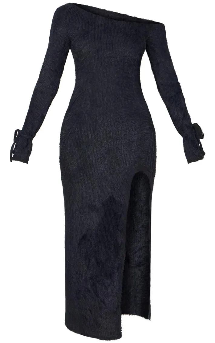 Elevate your weekend style game with this black fluffy one shoulder maxi dress. Brought to you in a black fluffy material with a one shoulder design and a maxi length, how can you say no? Style this maxi dress with chunky boots and gold accessories for a look that won’t go unnoticed.