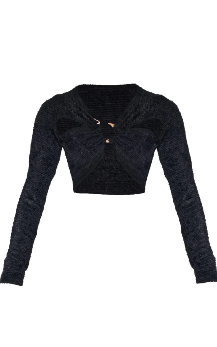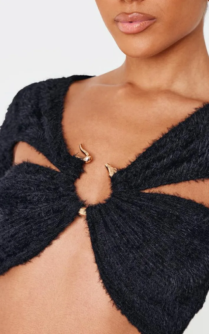 Make a statement in this black fluffy textured trim detail asymmetric long top. Made from a black fluffy textured material with an textured design, trim detailing and long sleeves, how can you resist? We are loving this black top styled with the matching skirt and knee length boots for a look that will turn heads.