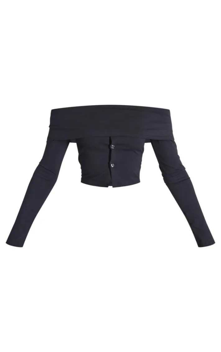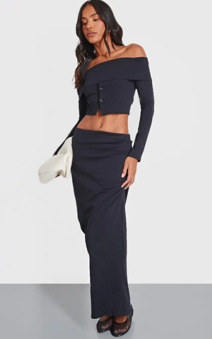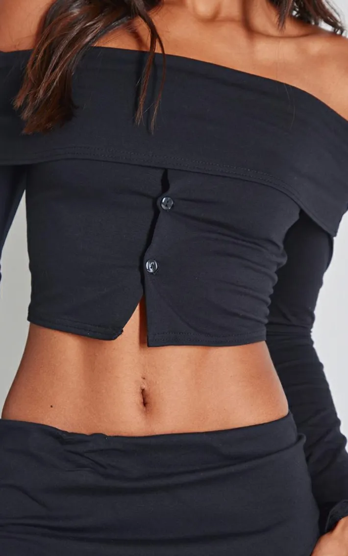 Keep it effortlessly chic with this black foldover button detail off the shoulder top. Brought to you in a black material with a foldover design and a button detail, we are seriously obsessed. Team this unreal off the shoulder top with the matching skirt and some ballet slippers to set major trends this season.
