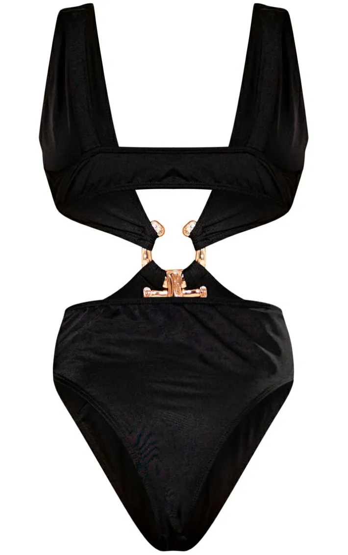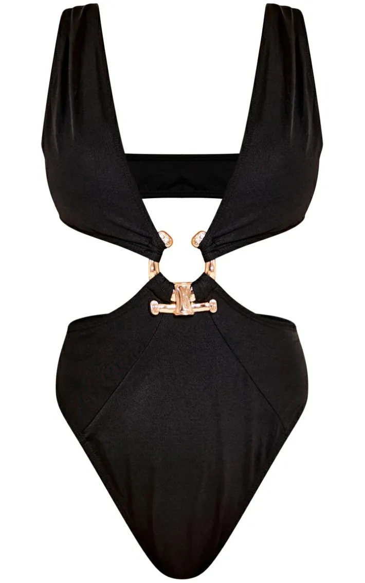 Swimsuits are a must have to add to your collection, that’s why this black hammered trim deep plunge cut out swimsuit is perfect for you. Brought to you in a black material with a hammered trim for a little added edge, and a deep plunge cut-out design for a flattering fit. Finish the look with statement sunnies and wedges for the ultimate poolside look.