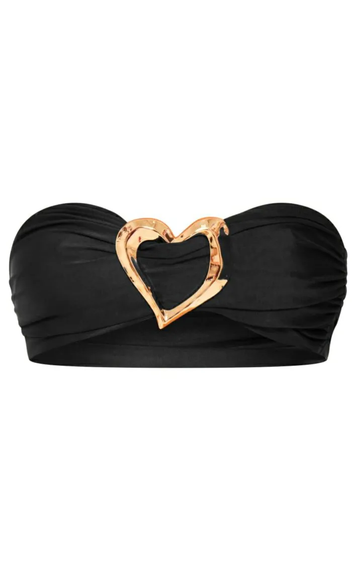 Take your poolside look to a whole new level with this black heart trim bandeau bikini top. Brought to you in a black hue material with a bandeau neckline, heart trim detailing for that extra touch of luxe, we are obsessed. Style this bikini top with the matching bikini bottoms and statement accessories for an outfit that is sure to have everyone by the pool looking your way.