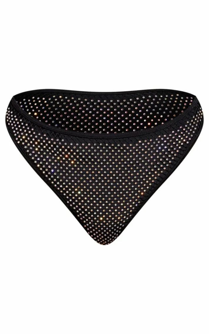 Lounge around the pool in style with this black hot fix fishnet high leg bikini bottoms. These bikini bottoms are brought to you in a black fishnet material with a hot fix design and a high leg fit, what’s not to love? These bikini bottoms are everything you need for your next pool party. So what are you waiting for? Shop the look and pair this with the matching bandeau, sandals and accessories for a flawless finish.