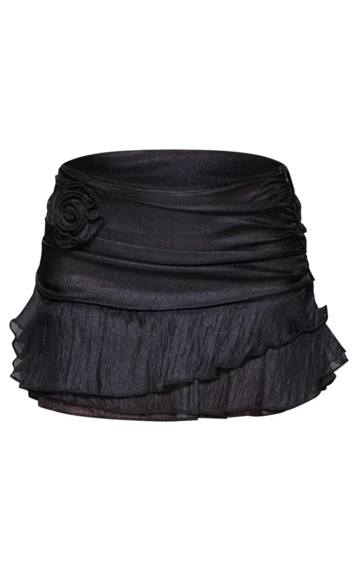 Step into the weekend the right way with this black iridescent chiffon rose detail mini skirt. Brought to you in a black chiffon material and a rose detail adding a touch of luxe to your look. Pair this mini skirt with a crop top and a pair of heels to elevate your look to new heights.