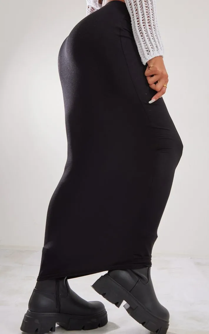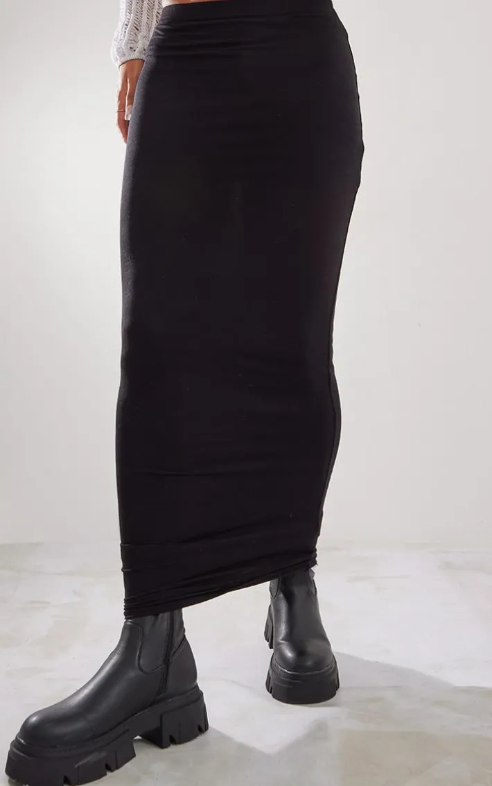 This maxi skirt is perfect for your new season wardrobe. Featuring a black jersey material with a low rise design and a maxi length, we’re in love. Wear with a crop top and chunky boots for a fierce off-duty ‘fit.
