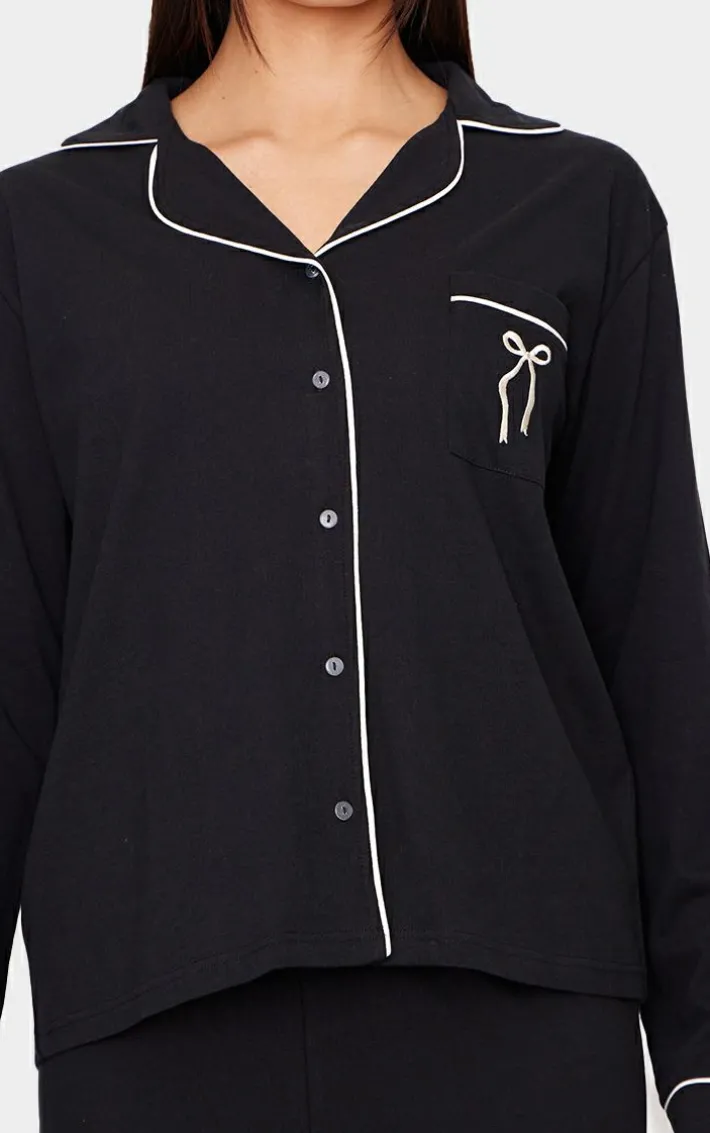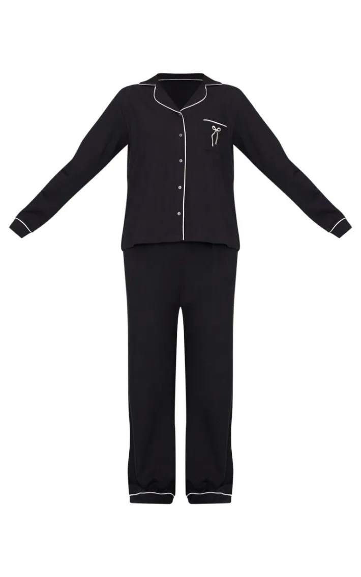 This black jersey piping embroidered bow long PJ set is calling to be added to your collection. Brought to you in a chic black shade, with a jersey piping design and luxe embroidered bow design, how can you say no? Team the top and bottoms together with a pair of slippers to complete the look.