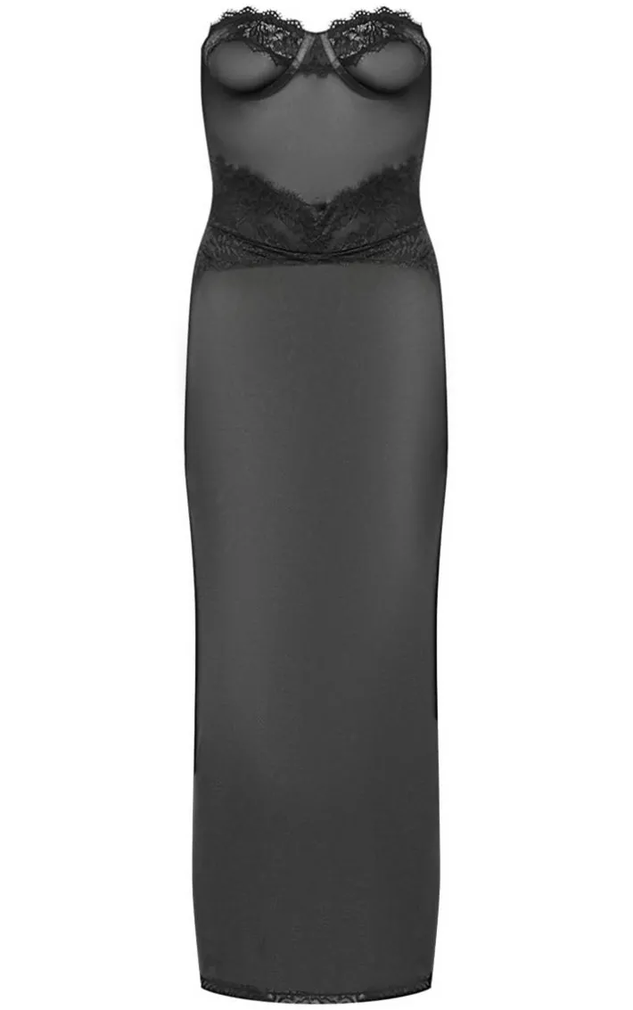 Turn up the heat this weekend and bring a little drama with this black lace bandeau underwired sheer midaxi dress. Made from a black sheer material which shows off your unreal figure and featuring lace detail that adds a delicate touch, what’s not to love? Seriously chic and effortlessly glam, this midaxi dress ticks all the boxes. Simply add clear heels and minimal accessories for a look that will steal all the stares.