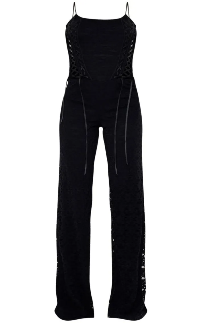 Get ready to look all kinds of chic in this black lace lace up strappy jumpsuit. Brought to you in a black hue lace material with a lace up design, what mroe could you want? In a figure-worshipping fit, you are sure to have all eyes on you in this black jumpsuit. Style with your highest heels and gold accessories to take the look to new heights.