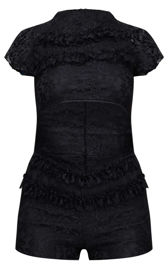 Opt for this black lace ruffle detail cut out rara unitard for a look that won’t go unnoticed. Brought to you in a staple black shade, with a luxe lace material, ruffle detail and statement cut out design, reach for this whatever your weekend plans. Style effortlessly with minimal accessories and heels for a chic finish.